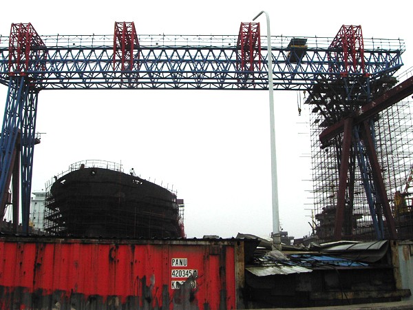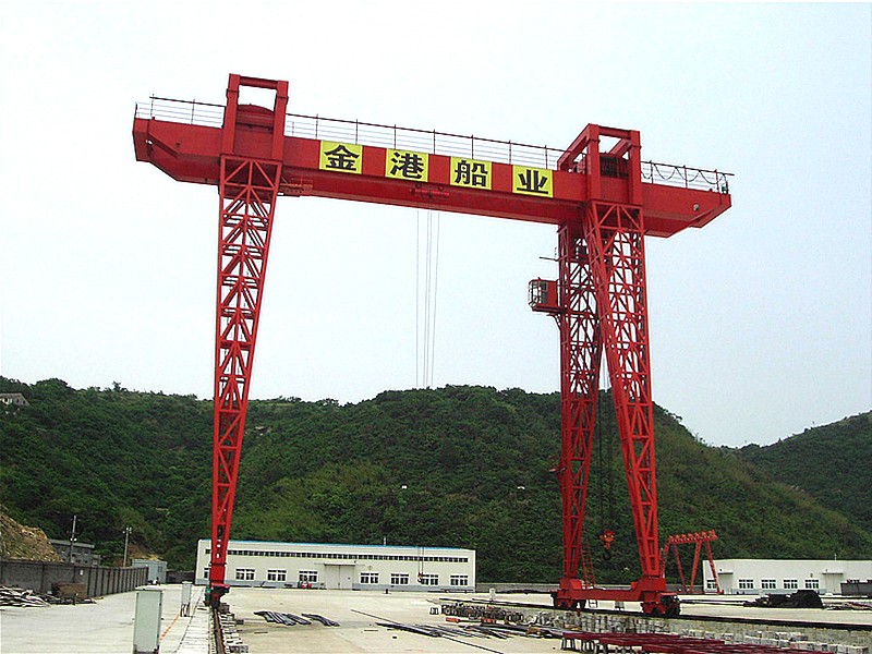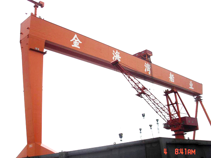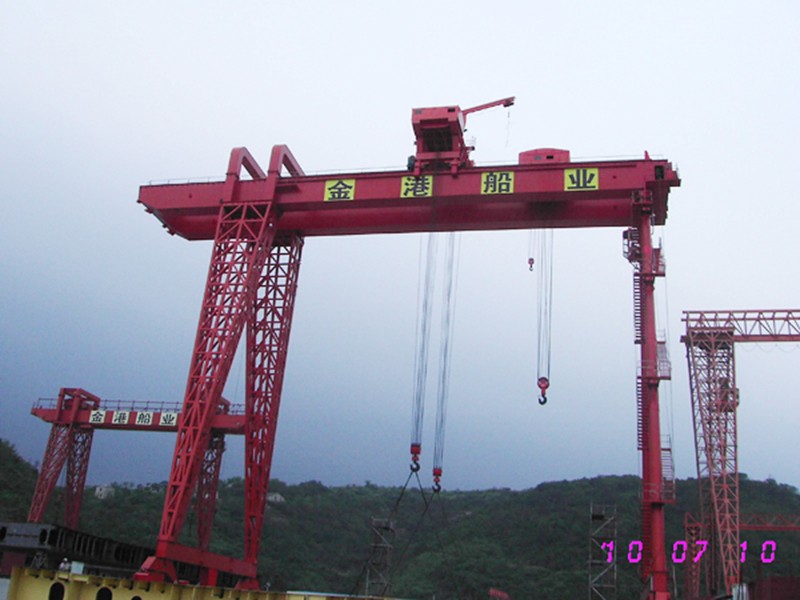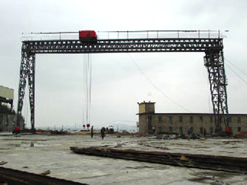 造船門式起重機適用于造船廠制作場所(船塢、船臺)進行造船作業,具有單吊、雙點抬吊、三點抬吊、空中翻轉吊件和輕載(≤50%滿載)快速升降、低風速(≤8m/s)快速運行等多種作業功能,在起重機整體吊裝